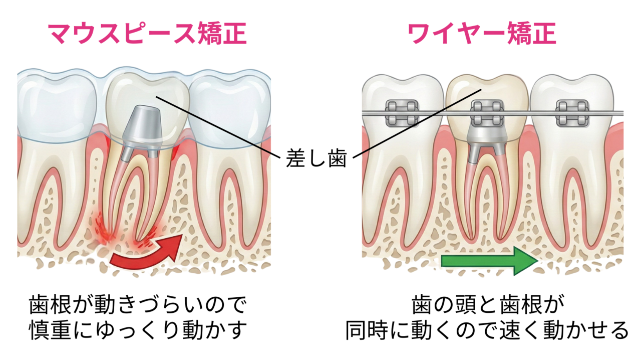 神経のない歯はマウスピースだけで動かそうとすると、歯の根っこがついてこずに、歯が斜めに倒れてしまうリスクがあります。
