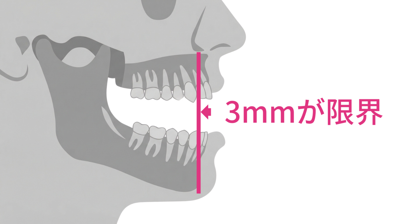 なぜこうした失敗が起こるかというと、前歯だけの矯正で引っ込められるのは3mmが限界だからです。