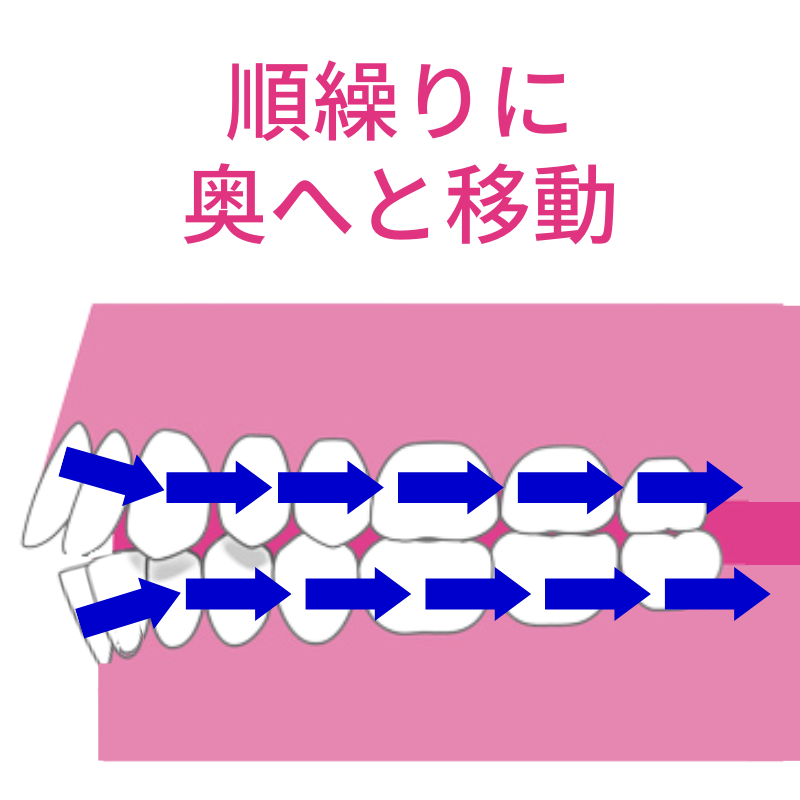 それにより空いたスペースに次の奥歯を動かし、さらに次の奥歯を動かします。