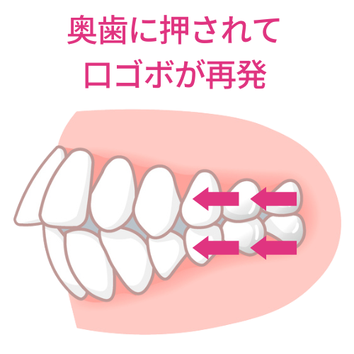 やがて前歯が斜めの奥歯に押し出されて、口ゴボが再発してしまう、というケースも決して少なくないのです。