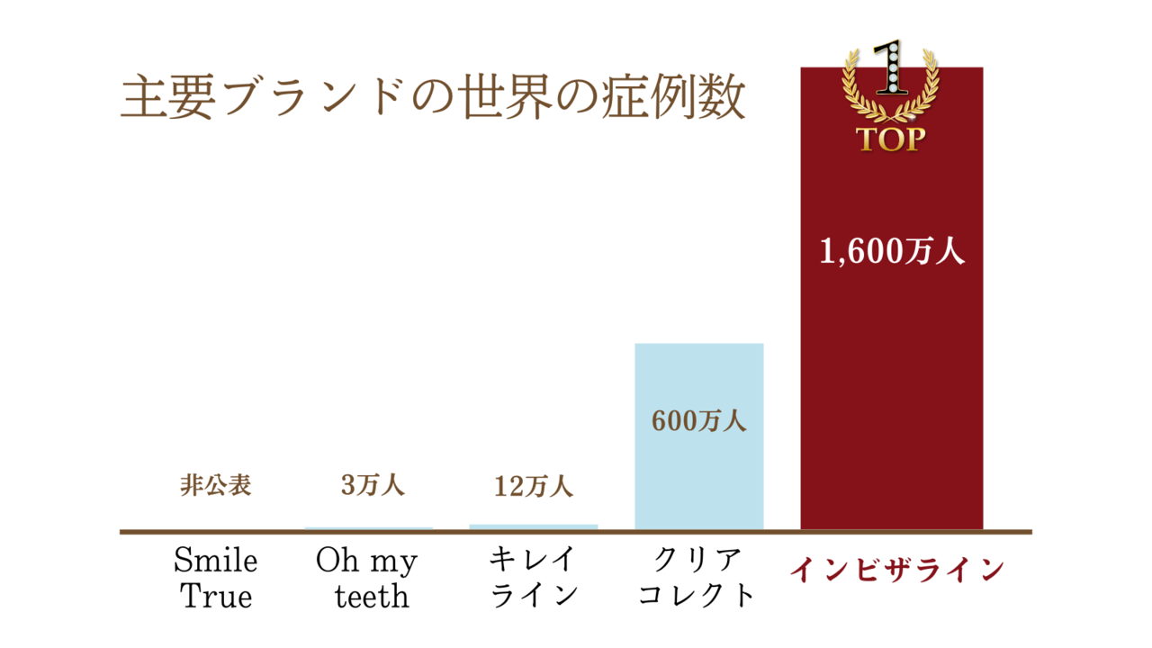 インビザラインの症例数は全世界で1,600万人。一方、格安アライナーの症例数はわずかに12万人。